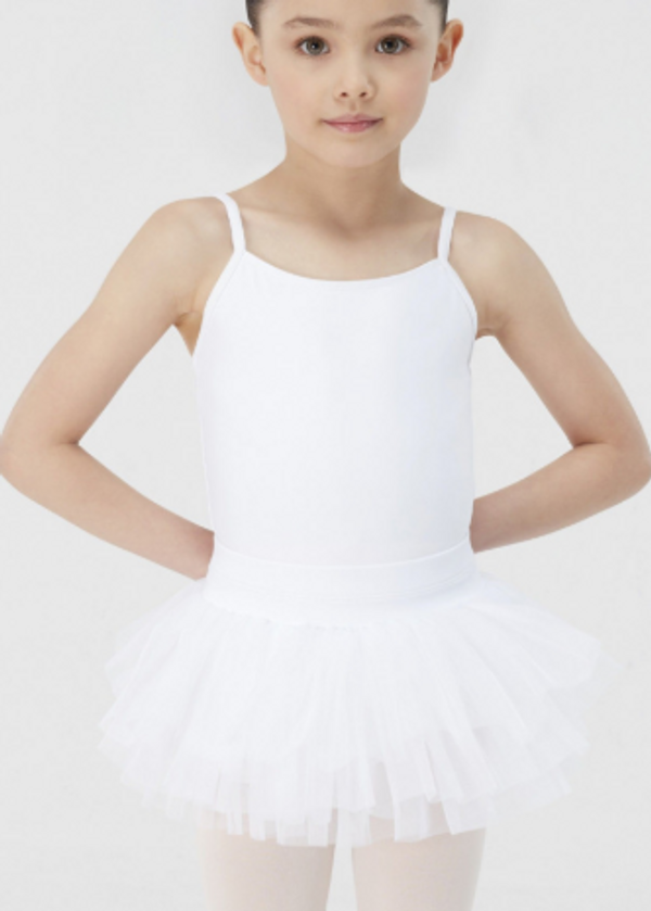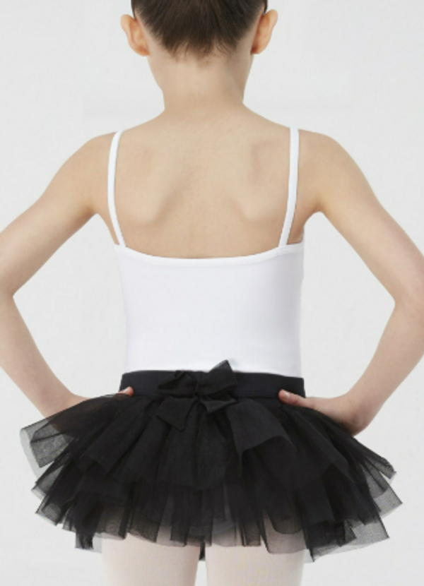 Tutu enfant composée d'une taille élastiquée microfibre, et de trois volants froncés en tulle transparent et d'un petit nœud sur le milieu dos