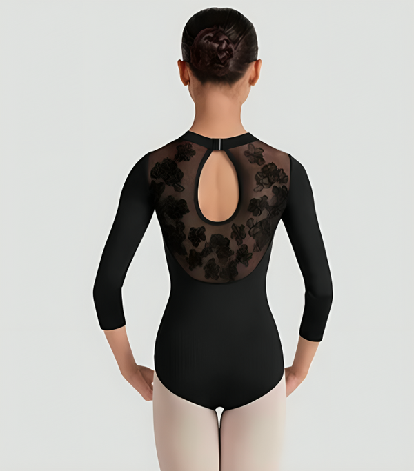 Pour la danse classique, le justaucorps de ballet Judy est une pièce de choix. Ce justaucorps de danse à manches ¾ présente un col montant avec un cœur, un dos en goutte d'eau orné de broderies en résille, et une fermeture à agrafe. Il allie confort et élégance pour tous les mouvements de danse