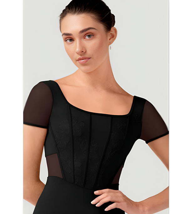 Son col carré et ses manches courtes en maille apportent une touche de douceur, tandis que les broderies florales inspirées des corsets soulignent votre silhouette. Le dos échancré assure une liberté de mouvement optimale.