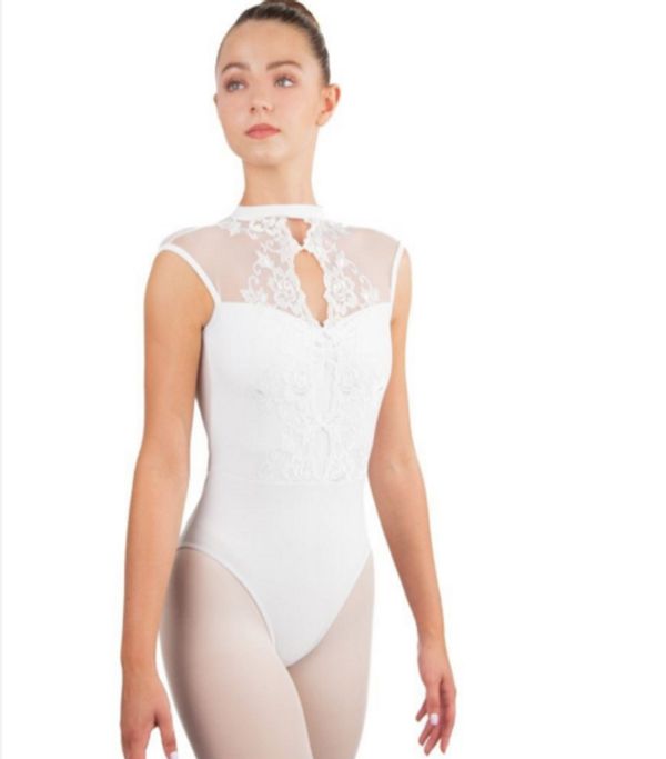 Ce justaucorps sans manches présente un élégant col officier orné d'une magnifique dentelle qui mettra en valeur votre décolleté tout en offrant un ajustement parfait pour vos mouvements de danse.