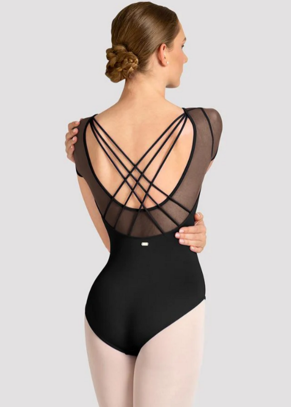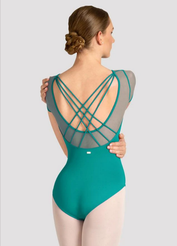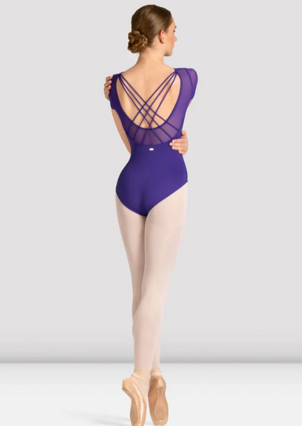 Le justaucorps Mirella Celeste de Bloch séduit par son élégant col montant et son dos ouvert à triple croisé.
