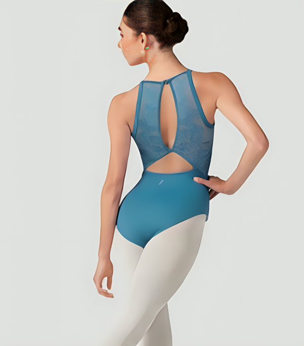 Justaucorps dos nu fleuri Iris pour préadolescente présente un décolleté haut orné d'un détail cœur romantique, des empiècements dos en résille florale finement brodés et un double dos ouvert avec fermeture à clip.