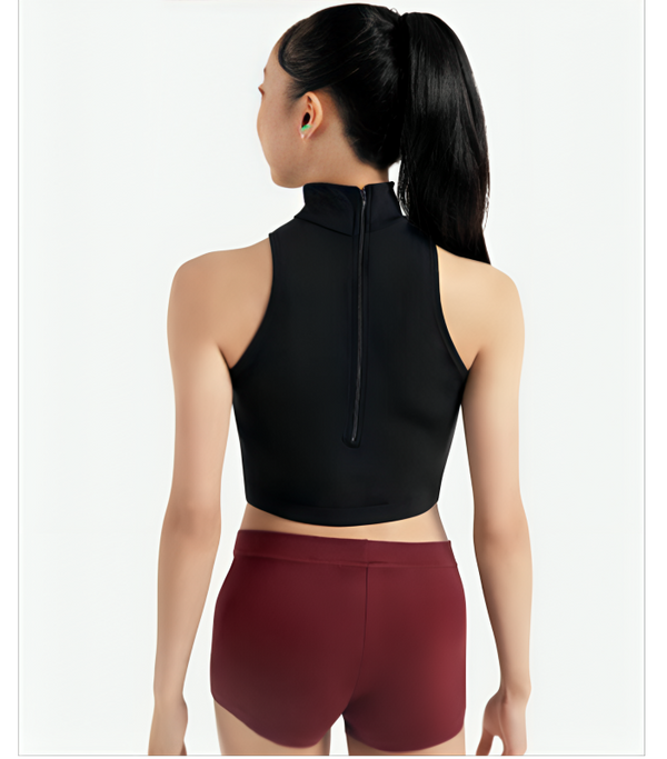 Que ce soit pour vos cours de jazz, de contemporain ou vos entraînements de fitness, son col montant (mock neck) apporte une touche sophistiquée. Le détail qui change tout ? Son zip fonctionnel qui peut être porté à l'avant ou à l'arrière selon votre style du jour. Sa bande élastique de 2,5 cm assure un maintien impeccable, même lors des chorégraphies les plus dynamiques.