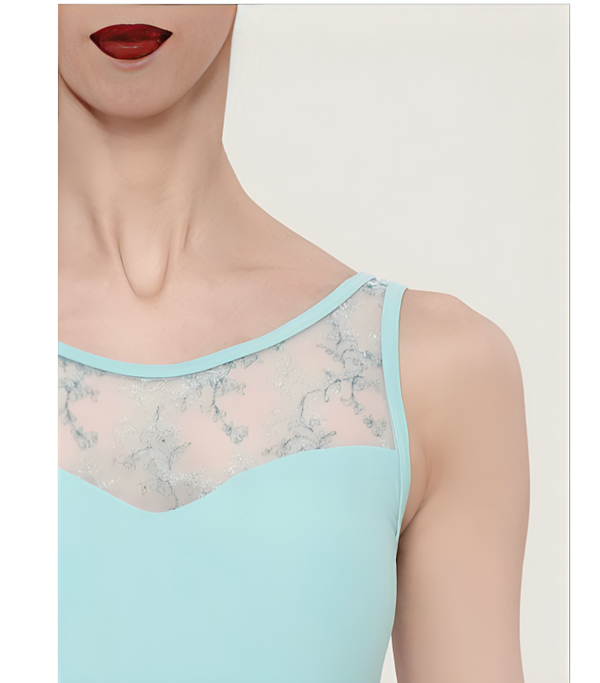 Un design unique pour la scène et le studio Ce justaucorps présente un décolleté en cœur souligné par un empiècement en tulle stretch brodé aux motifs floraux délicats. Son dos travaillé, avec une découpe élégante en pointe, met en valeur le port de tête et la ligne du buste. Les doubles bretelles fines assurent un maintien optimal tout en apportant une touche de modernité.