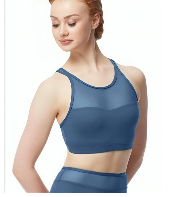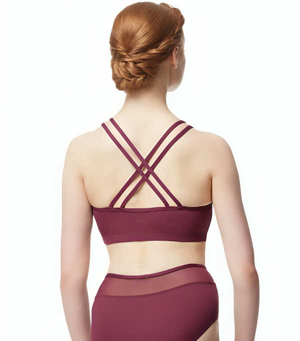 Ce top présente une encolure dégagée sublime soulignée par un délicat empiècement en résille (mesh), apportant une touche de modernité. Son dos est le véritable atout de ce modèle : des doubles bretelles croisées qui assurent un maintien irréprochable tout en libérant les omoplates pour une liberté de mouvement totale.